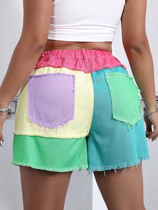 Short Plus Size Denim Color Block com Detalhes Desfiados – Estilo Casual e Moderno