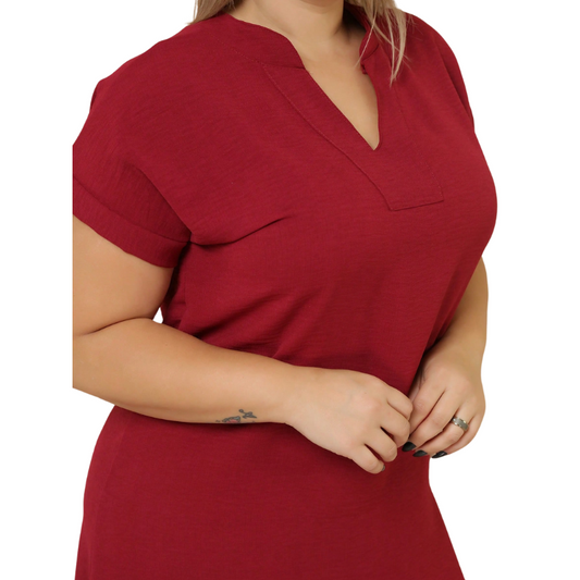 Vestido Curto liso Plus Size Manga Curta Gola V