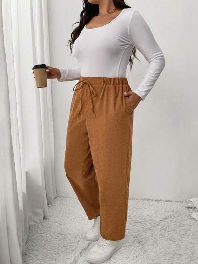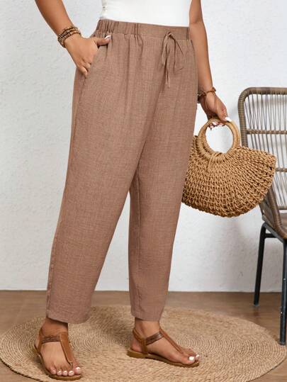 Complete seu look casual com esta calça plus size em tom damasco, que oferece cintura elástica confortável e bolsos diagonais funcionais. A peça tem ajuste regular e modelagem afilada, sendo uma escolha perfeita para dias de clima ameno, entre 18°C e 25°C.